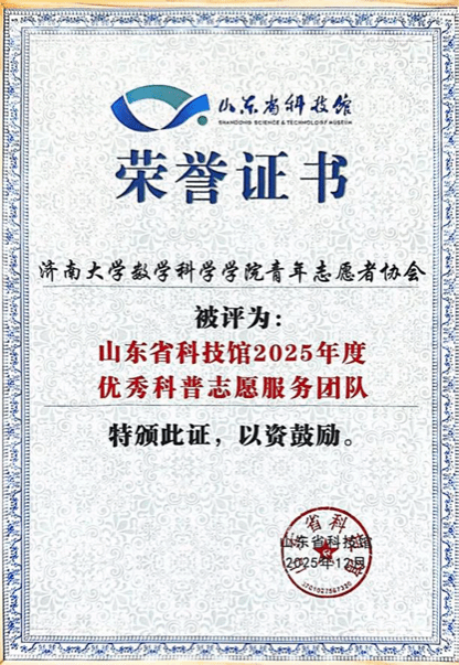 12月18日上午,山东省科技馆2025年度志愿者交流会议在馆内报告厅召开。济南大学数学科学学院青年志愿者协会凭借卓越的团队协作能力与亮眼的服务实绩,荣获年度优秀科普志愿服务团体奖;学院学生会青年志愿者协会主席田芮菡获评山东省科技馆2025年度优秀科普志愿者,充分彰显出数院学子的青春担当与志愿风采。