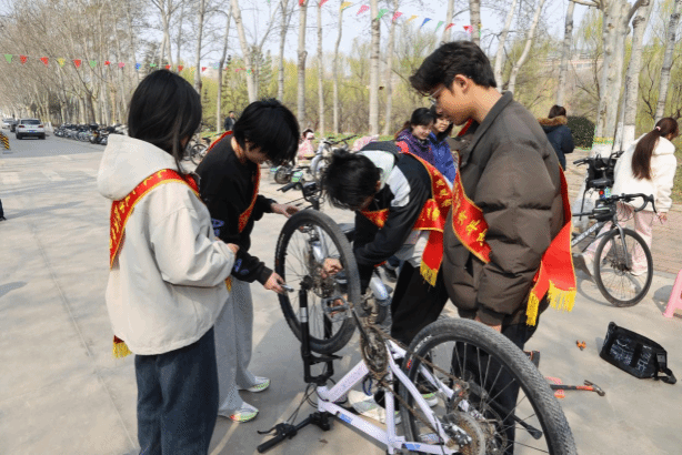 “同学,你的车刹车有点松,我帮你调紧些”“老师,您的车轮胎该充气了”——在济南大学第八食堂前的义务修车服务点活动现场,志愿者们自带扳手、螺丝刀、打气筒等专业工具,仔细为师生检修自行车。小到一颗螺丝的紧固,大到轮胎的更换,细致排查刹车灵敏度、轮胎胎压、链条松紧度等关键部位,每一个环节都力求精准。
